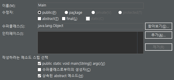 * 메인 클래스를 생성할 때는 아래 메소드 스텁에서 public static void main(String[] args)를 체크해줘야 한다.