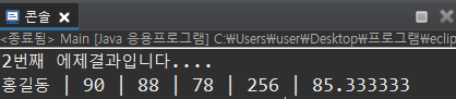 System.out.printf("%s | %d | %d | %d | %d | %f", name, kor, eng, math, sum, avg);