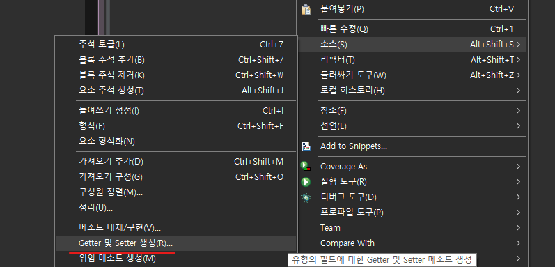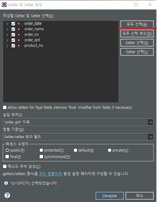 - private 필드 작성 후 마우스 우클릭 - 소스 - getter setter 메서드 생성 - 전체 필드 선택