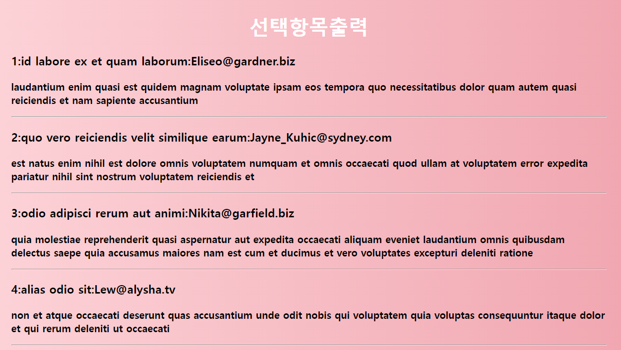 4. <h3> 태그에 id와 name email을 :(콜론)으로 구분해 출력하고 <p> 태그에는 body를 출력한다.