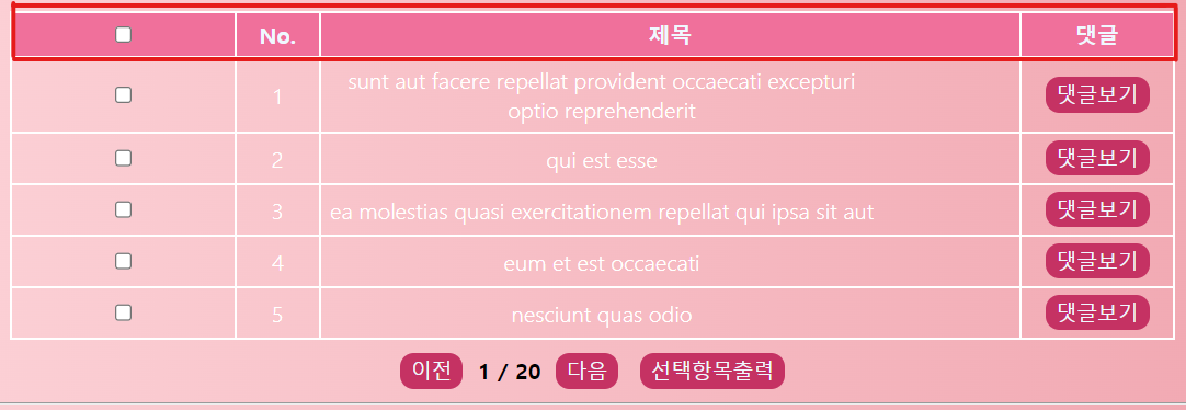 4. 출력할 데이터는 체크박스, 순번, 제목, 댓글버튼 총 네 가지이다.