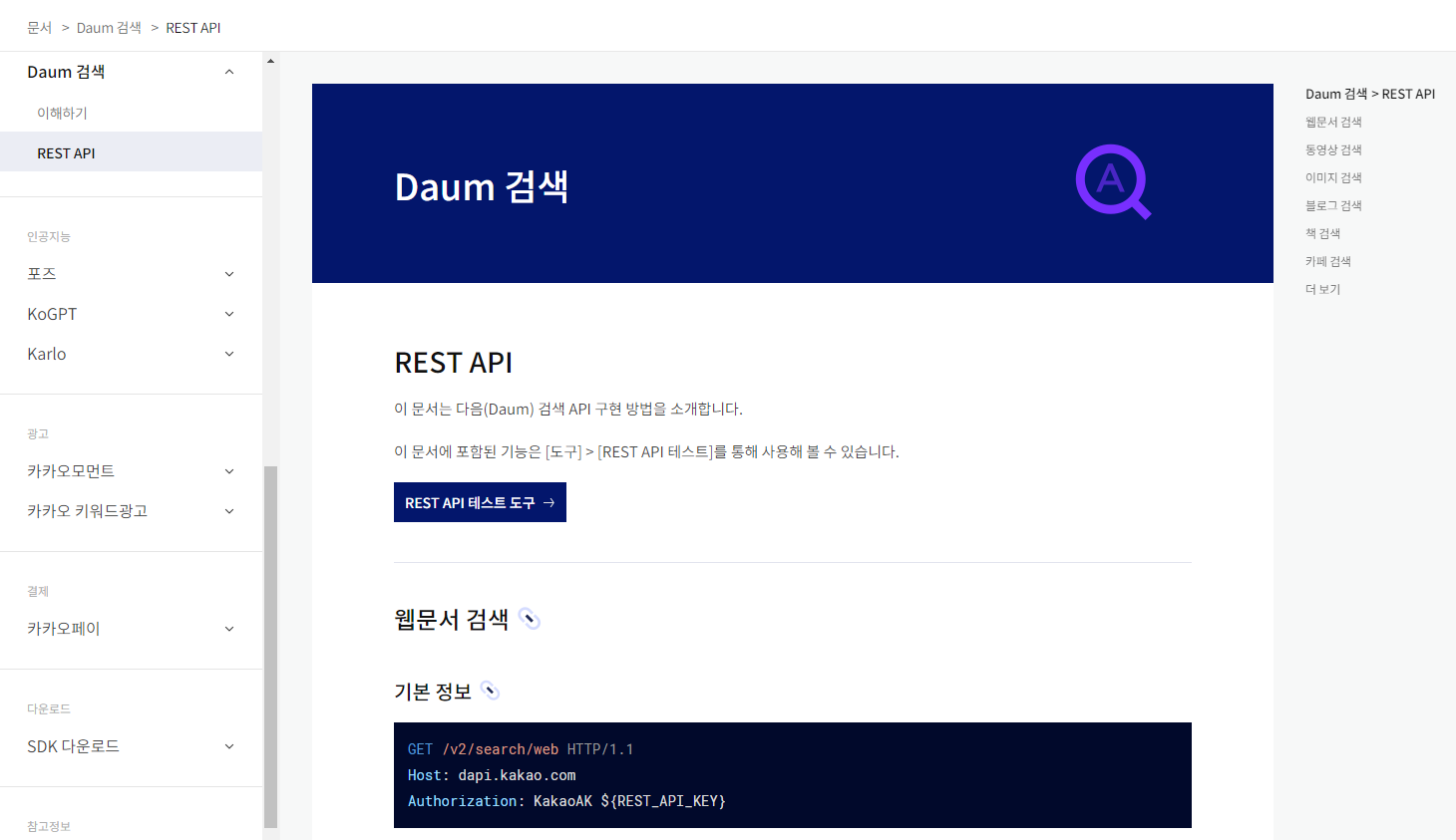 2. 문서에서 API타입 선택 -> 검색 -> REST API