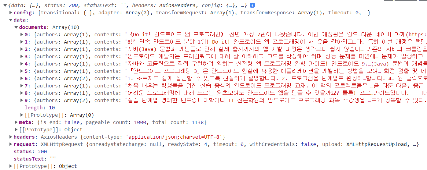 ** 개발자도구(f12)에서 콘솔에 찍힌 결과를 확인해 보면 데이터가 data의 documents에 담겨있는 것을 확인할 수 있다.