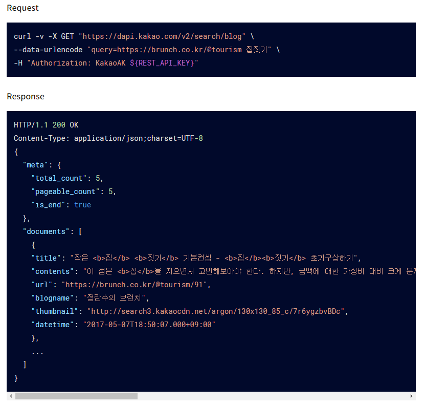 ※ Authorization: 뒤에 한 칸 띄어쓰기 KakaoAK 띄어쓰기 REST API키 (카카오 내 애플리케이션에서 확인)