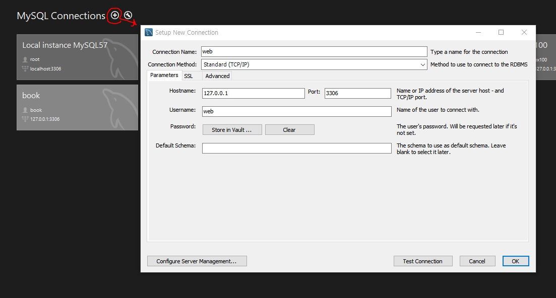 - 홈(mySQL Connections)으로 가서 +버튼으로 새로운 커넥션 생성, 유저 이름은 위에서 만든 web으로 설정한다
