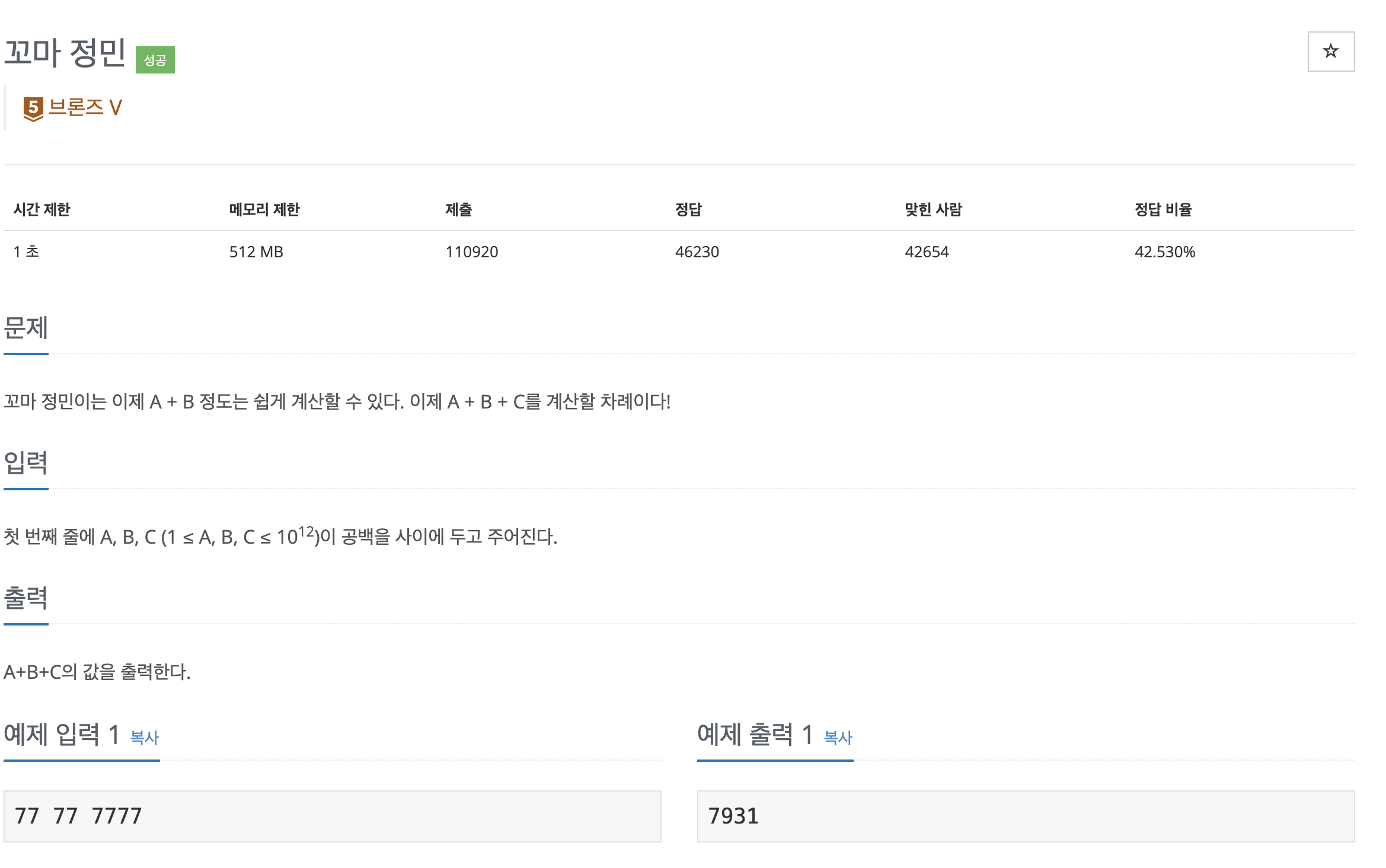 - A,B,C는 1이상 10의 12승 이하의 수이므로 int보다 더 큰 수를 담는 자료형 long을 사용해야 한다.