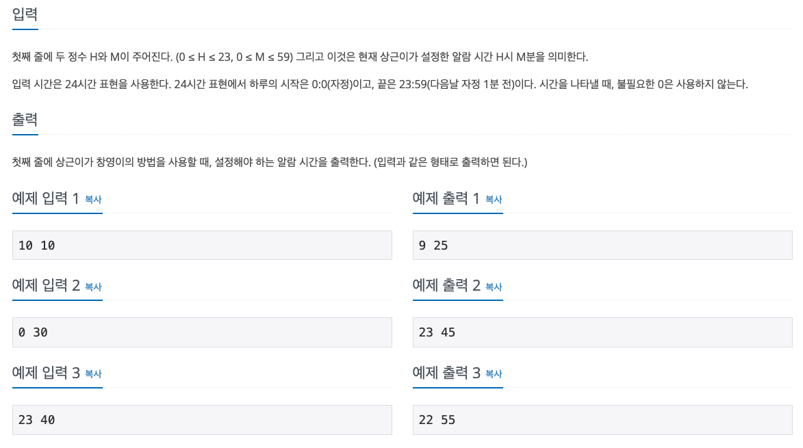 현재 상근이가 설정한 알람 시각이 주어졌을 때, 창영이의 방법을 사용한다면, 이를 언제로 고쳐야 하는지 구하는 프로그램을 작성하시오.