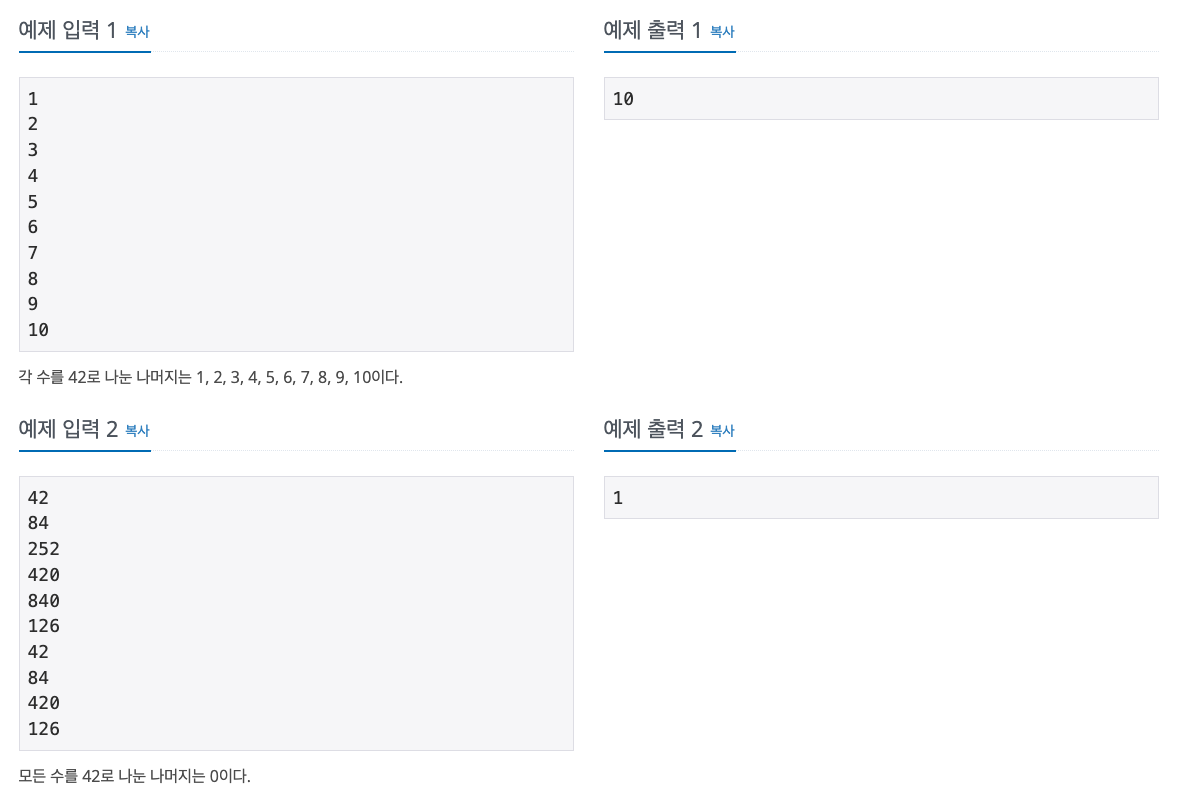 10개의 수를 받고 42로 나눈 나머지 값을 배열에 담아 서로 다른 수의 개수를 출력하는 문제이다