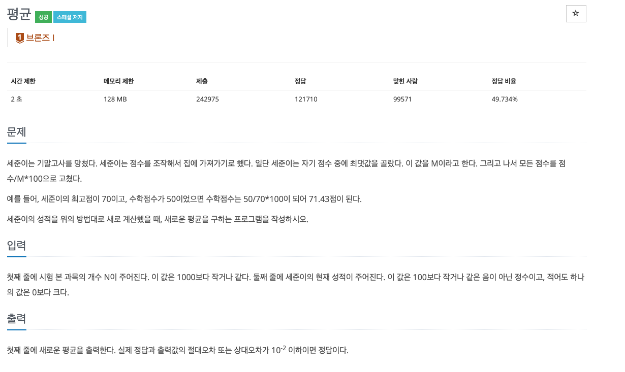 [백준] 1546번 - 평균 문제풀이 JAVA 자바 for문, 배열
