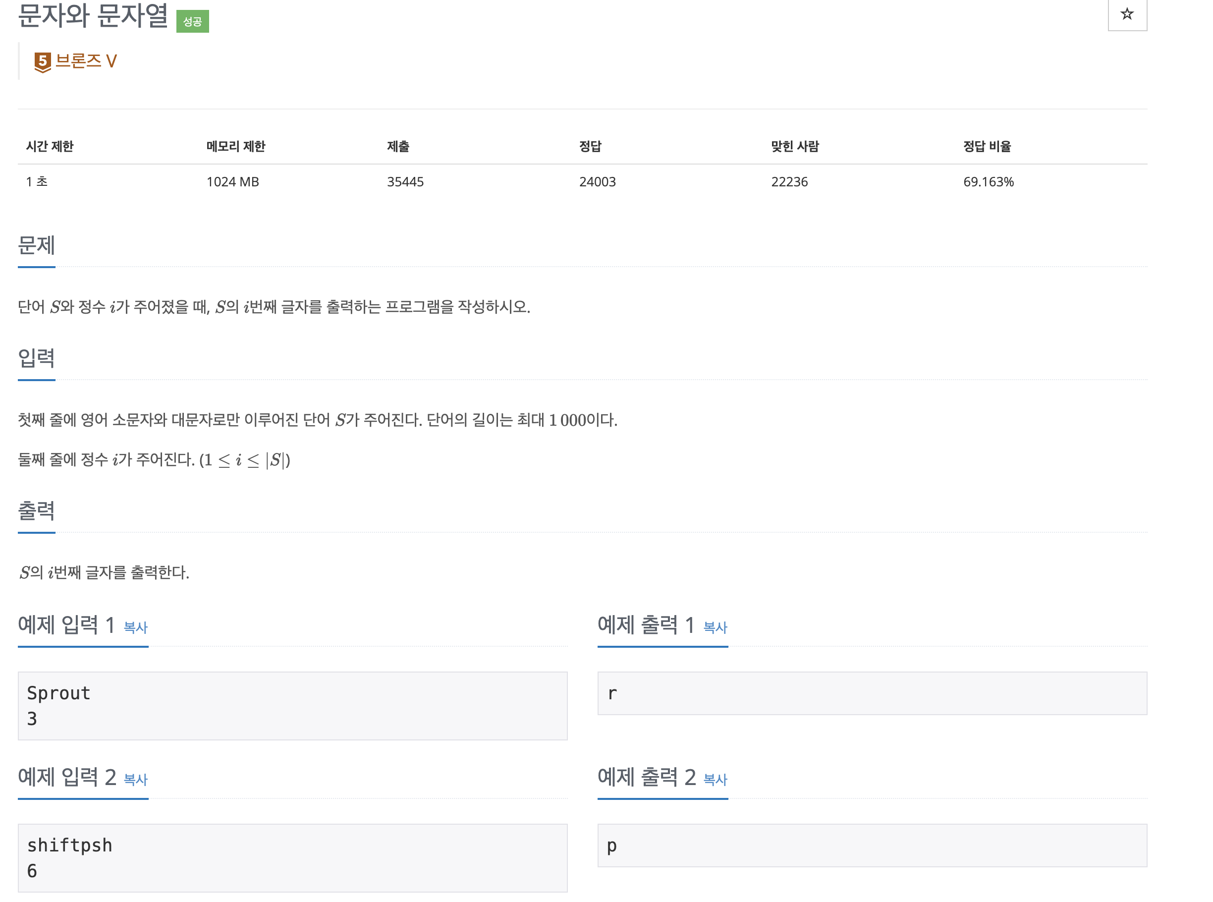 - 문자열을 입력받아 해당문자열에서 n번째 위치한 알파벳을 출력하는 문제